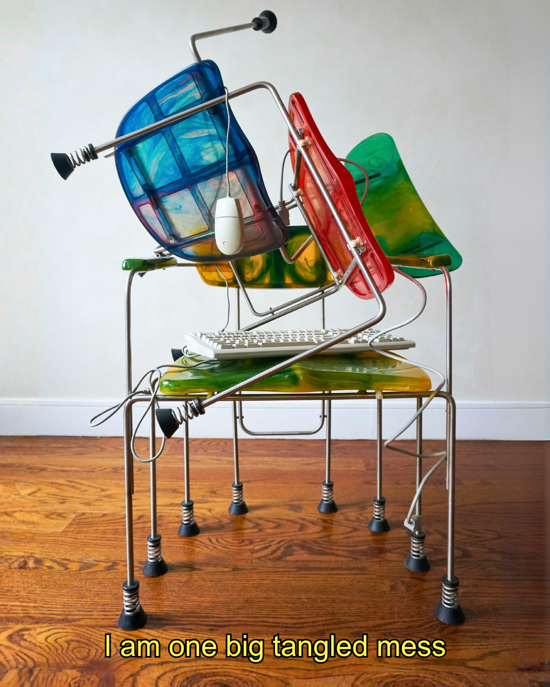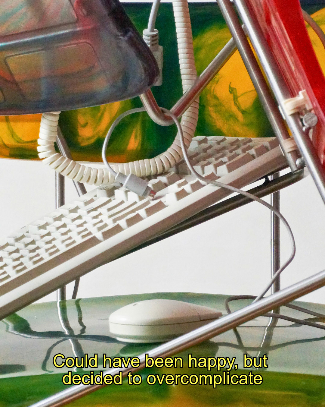 In collaboration with Sweeterfat, we imagined a photo and video campaign created to accompany the WORK/LIFE IMBALANCE exhibition. Revisiting Gaetano Pesce and Jay Chiat’s vision of an untethered workplace, the series collapses the boundaries between life and labor — turning resin, wires, and office relics into symbols of fluidity, play, and resistance to routine.